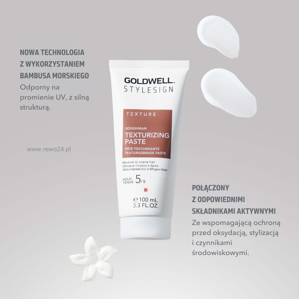 Goldwell Stylesign Texture Roughman to pasta do włosów, która zapewnia mocne utrwalenie przy zachowaniu matowego wykończenia. Zawarte w niej składniki, takie jak wosk pszczeli (Cera Alba) i wyciąg z bambusa, wzmacniają włosy oraz nadają im sprężystość. Produkt chroni pasma przed promieniowaniem UV. Nie obciąża ich i zachowuje przy tym elastyczność stylizacji.