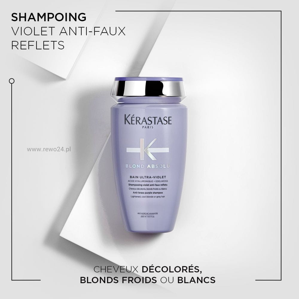 Fioletowy szampon tonujący Kérastase dla włosów blond, rozjaśnianych i siwych. Delikatnie oczyszcza, a jednocześnie neutralizuje żółte i miedziane tony, podkreślając chłodny odcień. Kwas hialuronowy nawilża i wygładza włókna, ekstrakt z szarotki alpejskiej działa antyoksydacyjnie i łagodzi uwrażliwione pasma. Po myciu włosy są miękkie, bardziej lśniące i optycznie rozświetlone. Idealny do pielęgnacji między wizytami w salonie i do podtrzymania efektu chłodnego blondu.