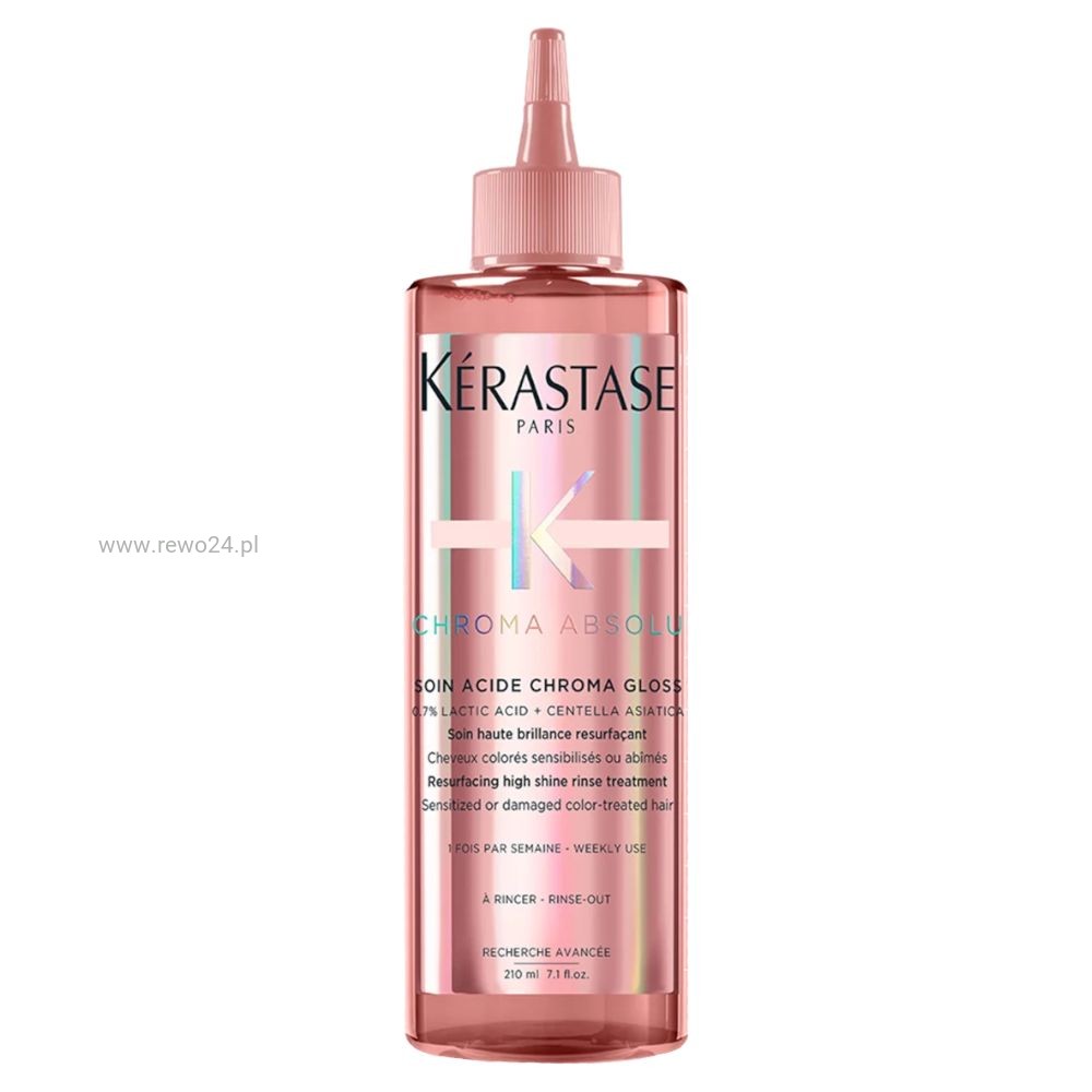 Kérastase Chroma Absolu Soin Acide Chroma Gloss to kwasowa kuracja do spłukiwania, stworzona dla włosów koloryzowanych, które po farbowaniu stają się porowate, matowe i podatne na puszenie. Lekka, płynna formuła w kontakcie z wodą zmienia się w krem, domyka łuski włosów, wygładza ich powierzchnię i nadaje intensywny, lustrzany połysk bez obciążania.