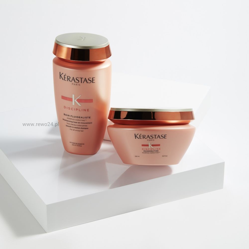 Kérastase Discipline Maskeratine to wygładzająca maska dyscyplinująca przeznaczona do włosów niesfornych, uwrażliwionych i trudnych do ułożenia. Formuła z linii Kérastase Discipline Fluidealiste pomaga ograniczyć puszenie się włosów, wygładzić ich strukturę i poprawić podatność na stylizację.