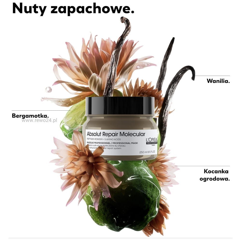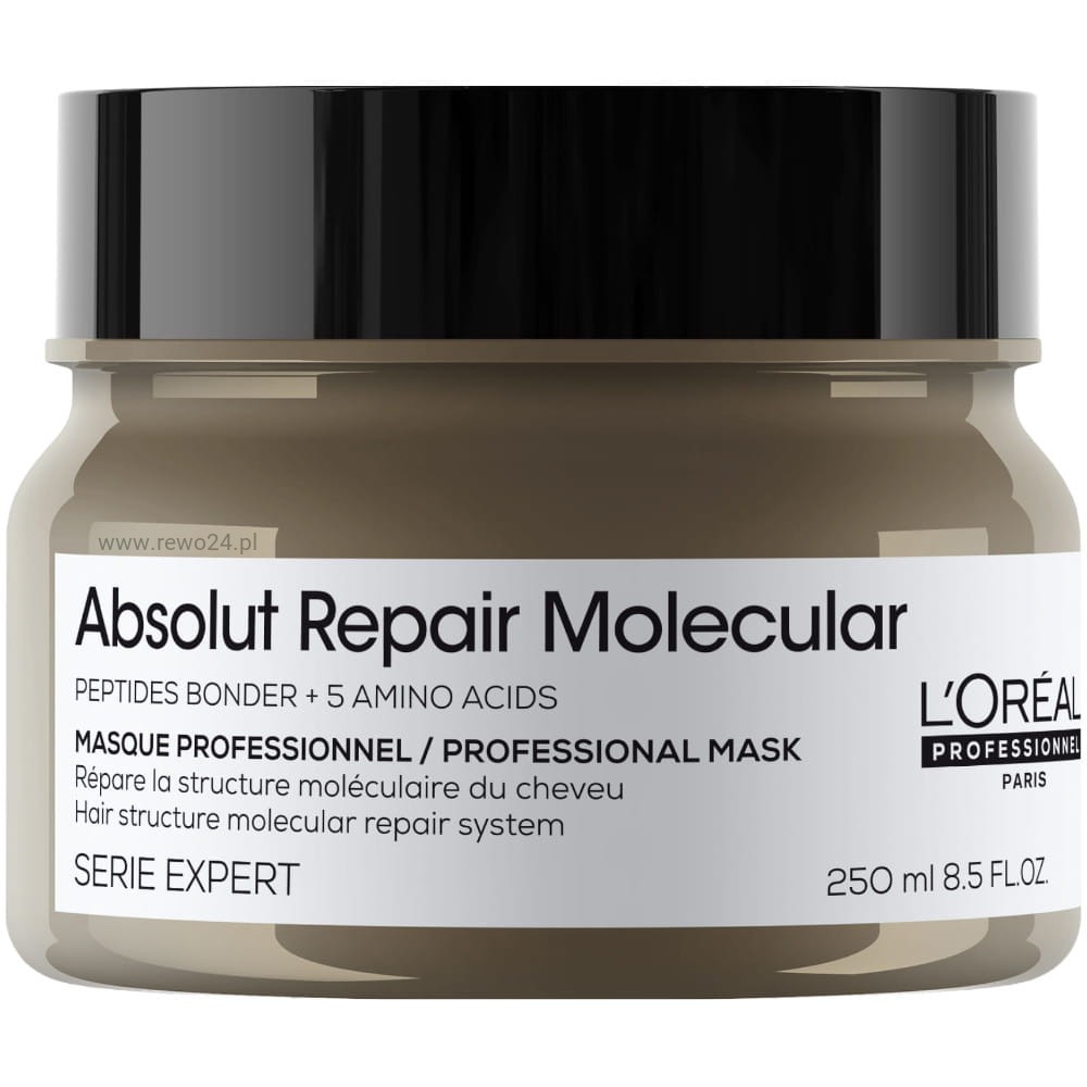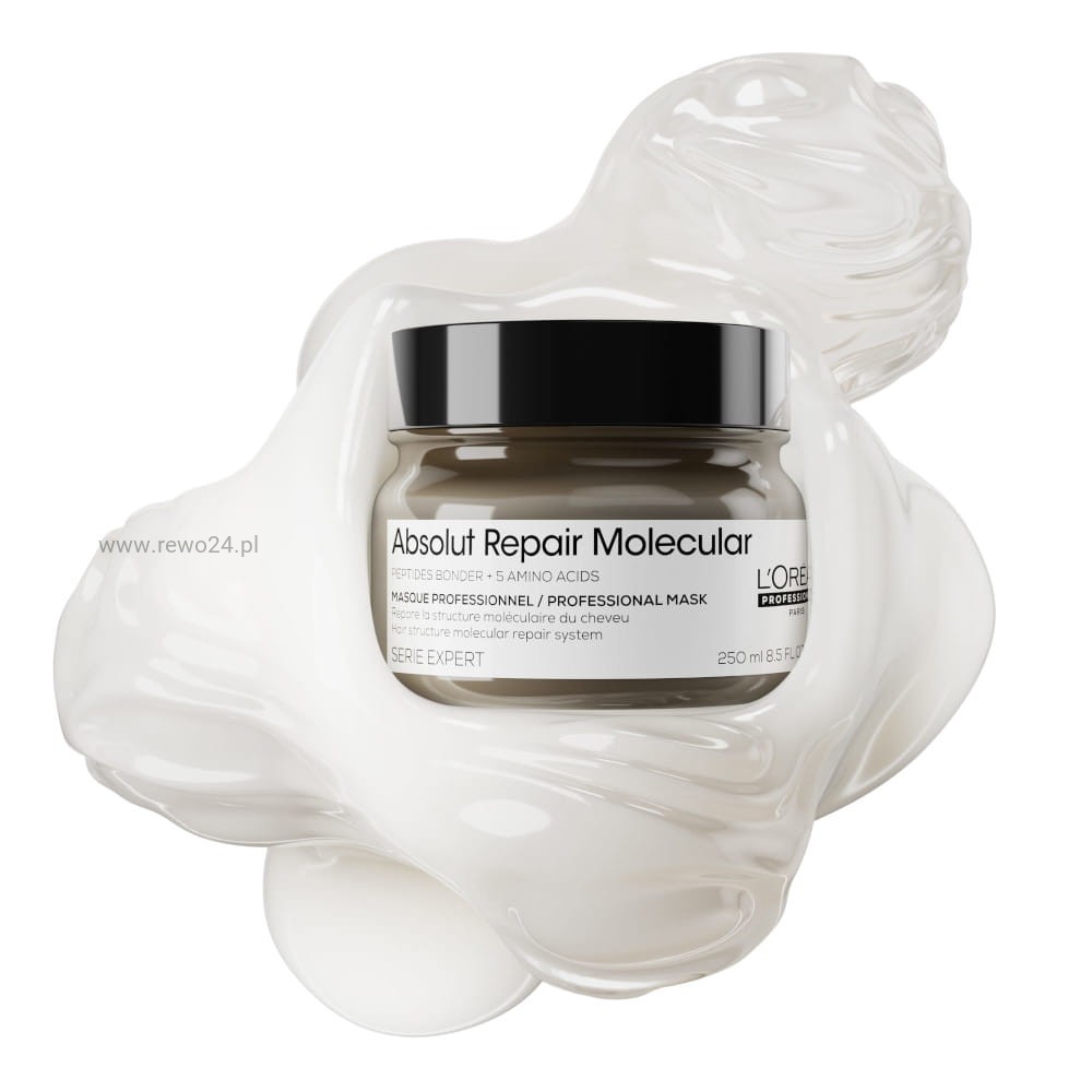 L’Oréal Molecular Maska to profesjonalny produkt do spłukiwania, wzbogacony peptydami i 5 aminokwasami, które skutecznie odbudowują strukturę molekularną włosów. Formuła głęboko wnika we włókna włosów, aby regenerować je na poziomie molekularnym. Efekty są widoczne od razu – włosy stają się bardziej lśniące, wygładzone i pełne objętości oraz sprężystości.