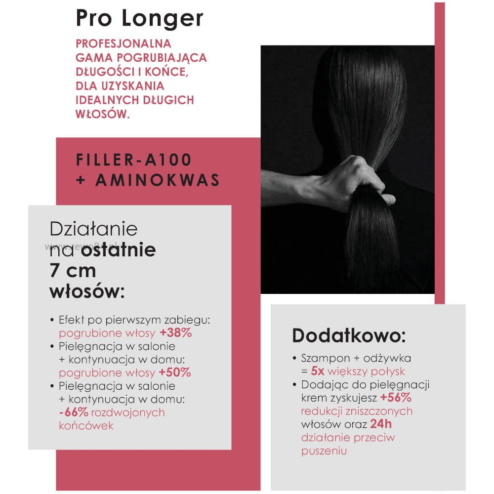 Formuła z dodatkiem Filler A-100 oraz aminokwasu sprawia, że włosy wydają się mocniejsze i bardziej błyszczące na całej długości.