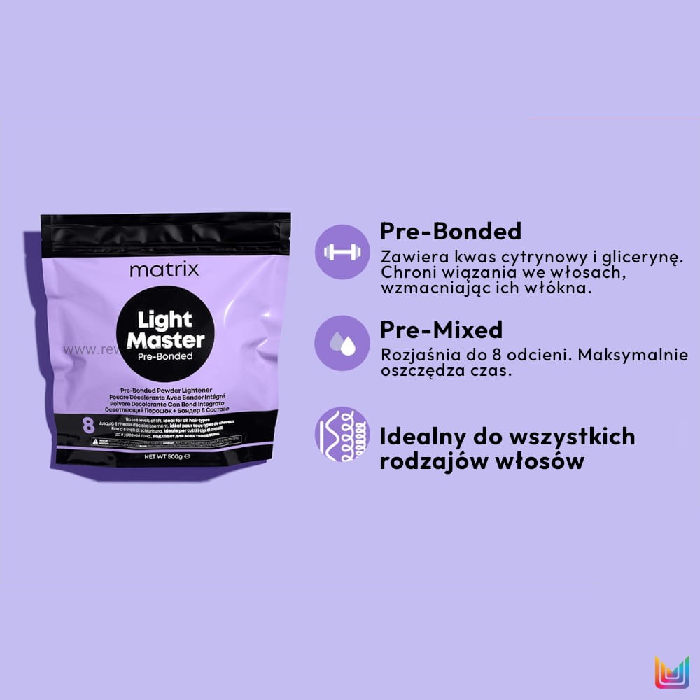 Matrix Light Master Bonder Inside to innowacyjny rozjaśniacz do włosów w proszku, który pozwala uzyskać rozjaśnienie nawet do 8 poziomów przy jednoczesnej ochronie struktury włosa. Zawiera technologię Pre-Bonded z kwasem cytrynowym, która wzmacnia i chroni mostki dwusiarczkowe podczas zabiegu, ograniczając łamliwość i przesuszenie. Idealny do wszystkich technik rozjaśniania - od pasemek po dekoloryzację pełną.