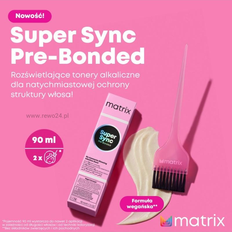 Toner Matrix Super Sync Pre-Bonded to doskonała opcja do odświeżenia koloru włosów. Farba pozwala na koloryzację ton w ton, co sprawia że efekt jest subtelny i naturalny. Specjalna formuła produktu zawiera oleje, które umożliwiają gładką i równomierną aplikację od nasady po końce. Ta półtrwała farba do włosów zapewnia pokrycie siwych włosów do 50%. Aby uzyskać najlepsze rezultaty, wystarczy wymieszać farbę z oksydantem Matrix 3% w proporcji 1:1.