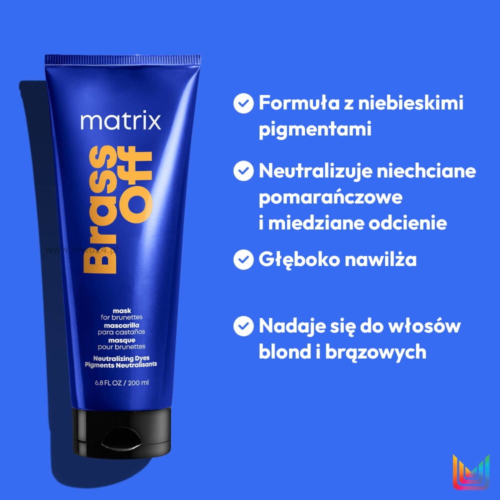 Lekko kremowa, niebiesko-fioletowa maska z linii Matrix Total Results Brass Off do włosów blond, rozjaśnianych i z pasemkami. Formuła z pigmentami chłodzącymi pomaga neutralizować pomarańczowe i miedziane refleksy, a jednocześnie wygładza, zmiękcza i nabłyszcza pasma. Idealna jako uzupełnienie szamponu i odżywki Brass Off, gdy chcesz szybciej przywrócić chłodny odcień i poprawić kondycję uwrażliżonych włosów.