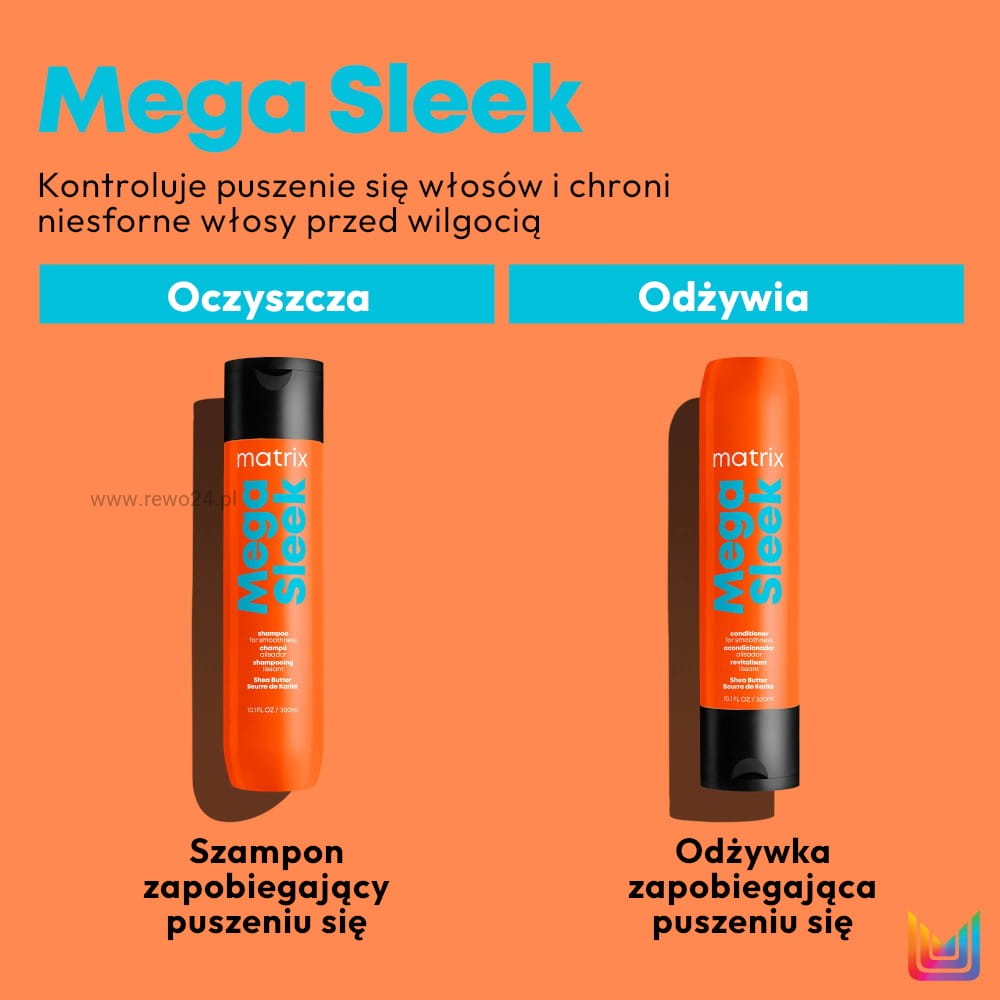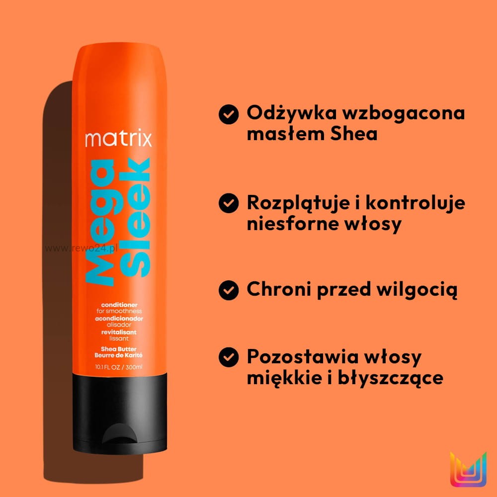 Wybierz pomarańczową odżywkę Matrix Mega Sleek aby wzmocnić efekt wygładzenia.