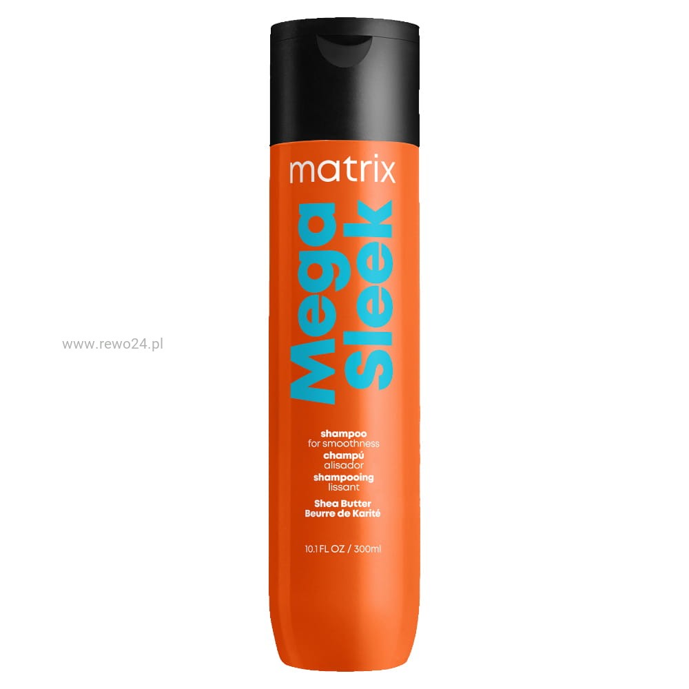 Szampon Matrix Mega Sleek do włosów puszących się i niesfornych. Delikatnie oczyszcza, a jednocześnie wygładza i pomaga kontrolować puszenie pod wpływem wilgoci. Po myciu włosy są bardziej gładkie, sypkie i łatwiejsze do ułożenia, bez obciążenia.