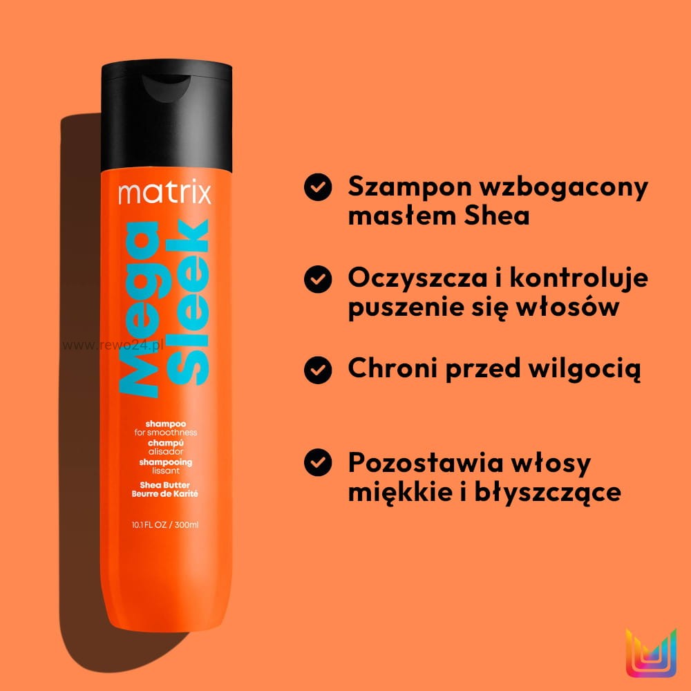 Sięgnij po pomarańczowy szampon Matrix Mega Sleek, jeśli Twoje włosy wymagają codziennej kontroli nad puszeniem i gładkiego, lśniącego wykończenia.