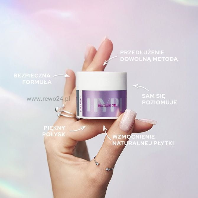 Żel budujący Hype Gel Pink Sparkle to profesjonalny cover w różowym odcieniu z drobinkami o efekcie reflective. Dzięki średnio gęstej konsystencji i właściwościom tiksotropowym nie rozlewa się na skórki i sam się poziomuje, co ułatwia aplikację. Zapewnia 80% krycia, maskując niedoskonałości płytki i nadając stylizacji wyjątkowego blasku, który najmocniej ujawnia się w ostrym świetle.
