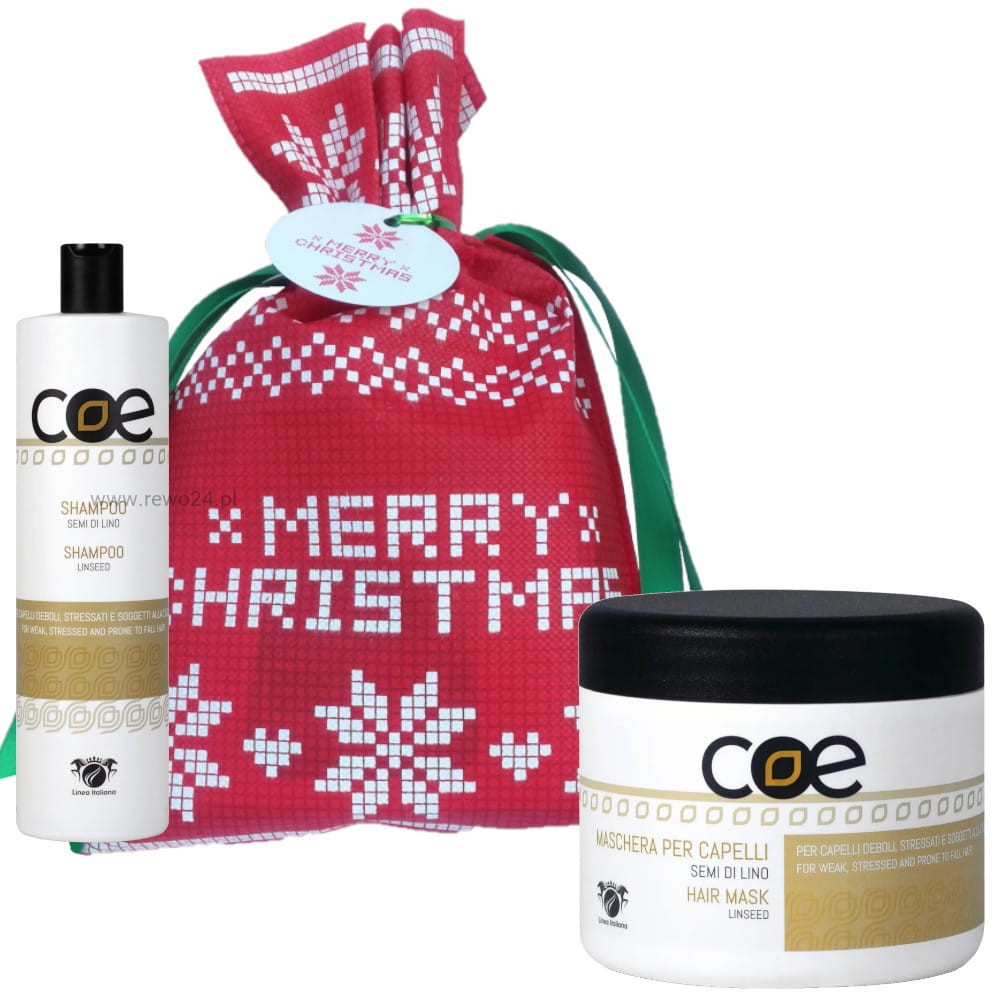 Podstawowy zestaw świąteczny Linea Italiana COE Linseed to kompletna, regenerująca pielęgnacja dla włosów słabych, zniszczonych i skłonnych do wypadania. Połączenie szamponu i maski Linseed wzmacnia włosy od nasady, ogranicza ich łamliwość oraz wspiera naturalny wzrost. Całość zapakowana w świąteczny worek Merry Christmas tworzy gotowy prezent o wyjątkowym, zimowym klimacie.