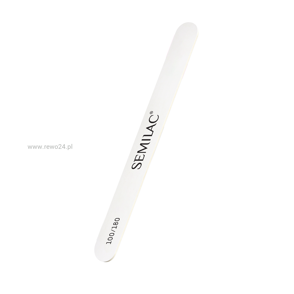 Wąski drewniany pilnik w kolorze białym o średnioziarnistej powierzchni. Drewniany rdzeń wykonany z wysokogatunkowego drewna zapewnia odpowiednią twardość i wytrzymałość pilnika. Gradacja 100/180 stosowana jest przy podstawowym opracowywaniu paznokcia, jak i obróbce masy żelowej i akrylowej.