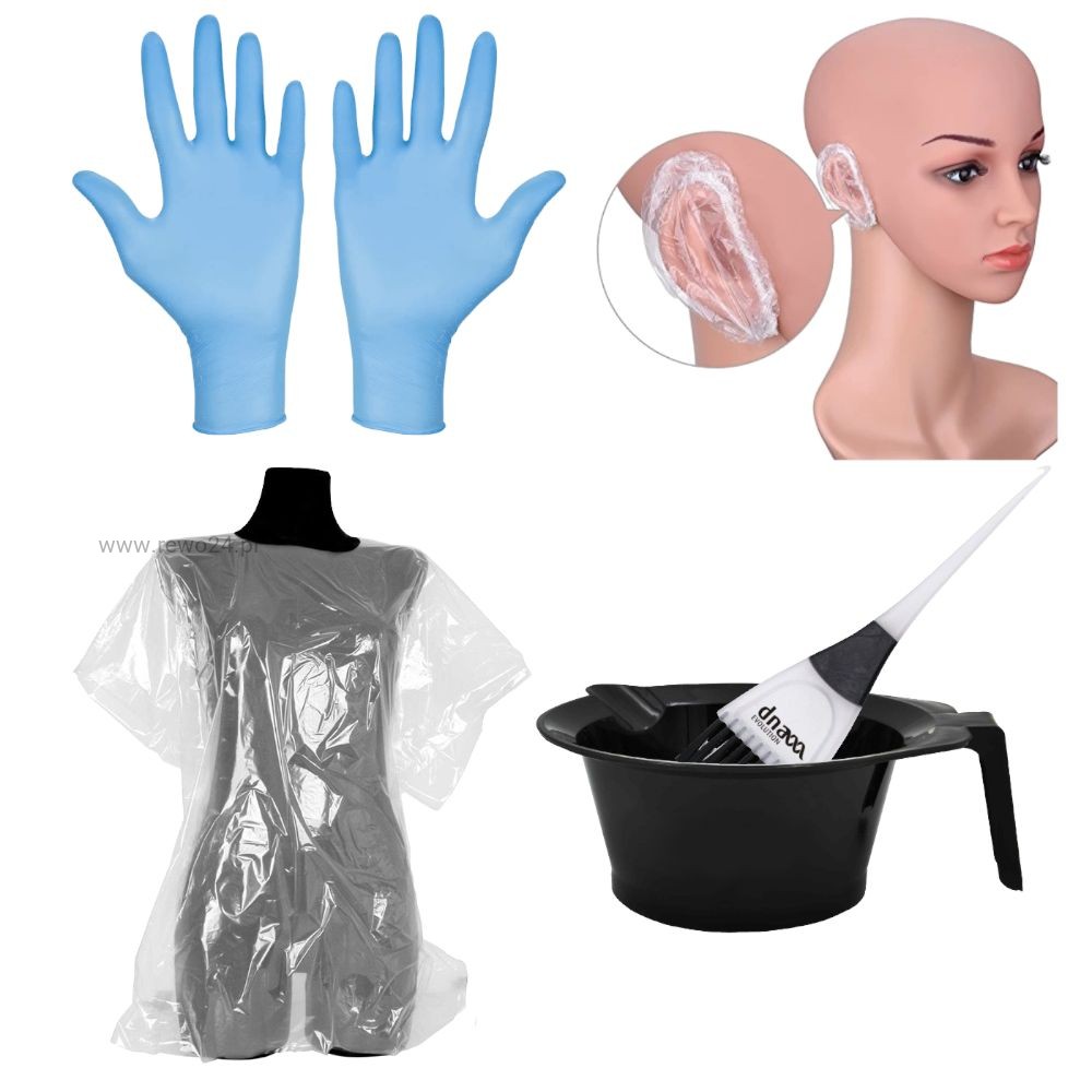 - Akcesoria jednorazowe wykonane z grubego materiału, pozwalające na wykonanie kompletnego zabiegu farbowania