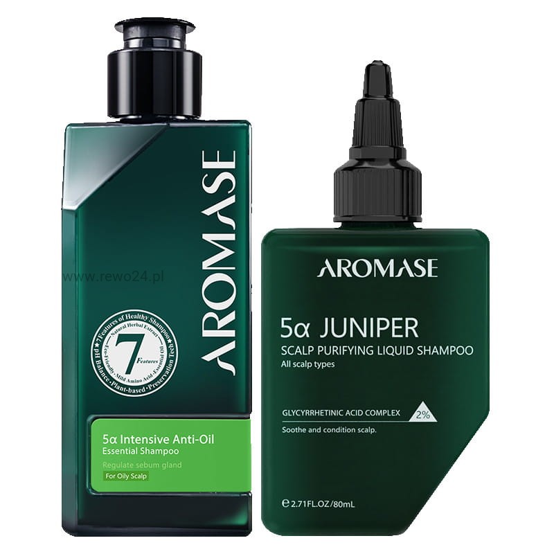 Zestaw do włosów przetłuszczających się Aromase Anti Oil to profesjonalna pielęgnacja regulująca sebum i przywracająca komfort skóry głowy. Peeling 5α Juniper usuwa nadmiar sebum, martwy naskórek i resztki stylizacji, a szampon 5α Anti-Oil oczyszcza skórę głowy bez przesuszania i pomaga utrzymać jej równowagę. Zestaw do włosów sprawdza się przy przetłuszczaniu, swędzeniu, dyskomforcie oraz skłonności do łupieżu.